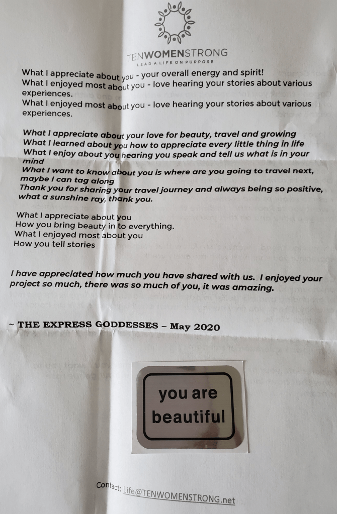 My eternal gratitude to “TenWomenStrong” – awe-inspiring Carolyn Dragon & Kat Conner for holding the space so beautifully and amazing “The Express Goddesses“ for being so authentic & inspiring. Most importantly, cherish the precious bonds of friendship formed for life!