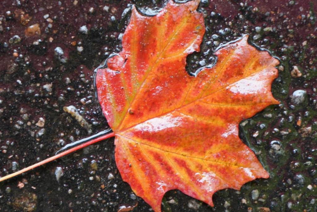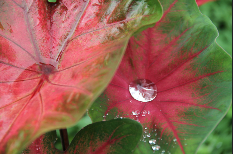 Raindrops fall gently from skies about and glisten like diamonds on a leaf
